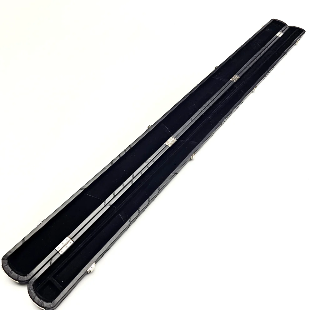 The hinge is an integral part of the shape of the case making it extremely robust. The catches are of the highest quality with a highly polished chrome finish. The interior is black flocked foam to hold the cue securely in place. As the foam interior has two channels the case will also hold any screw in extensions that may also be required (or even two cues).