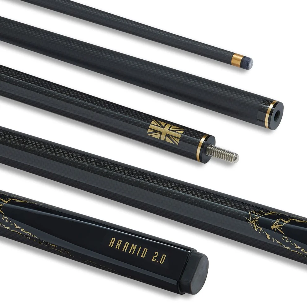 | Specifications | Cue Length: 57" (145cm) Tip Size: 9.5mm – 10mm Shaft: Carbon Fibre Shaft Length: Butt: Carbon Fibre Butt Length: 72cm Butt Decoration: Ultra smooth metallic high gloss multi layered paint and lacquer finish Joint: Yes, 2 piece centre joint Butt End Joint: No |