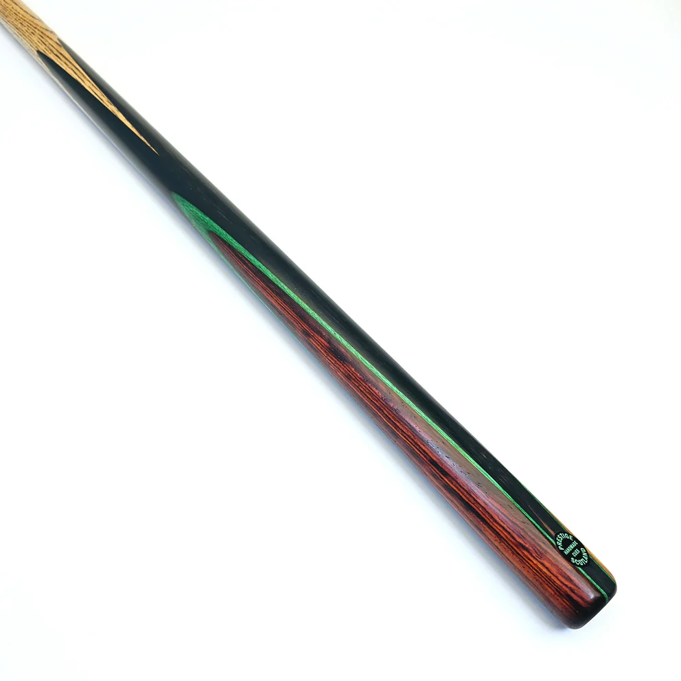 | Specifications | Cue Length: 57" – 57.75" Tip Size: 9.1mm – 9.5mm Shaft: Ash Shaft Length: 58" Butt: Ebony Butt Length: 19" Ebony Butt Decoration: Cocobolo, Olivewood, Green veneer Joint: One Piece Butt End Joint: Yes |