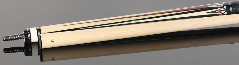Crafted for the discerning player, this cue showcases a striking Ebony forearm and butt sleeve, adorned with a dynamic interplay of four short Cocobolo points accented in white and silver, paired with four long white points enriched with Cocobolo and silver detailing. This sophisticated dual-point design graces both the forearm and butt sleeve, creating a bold yet refined visual symmetry.